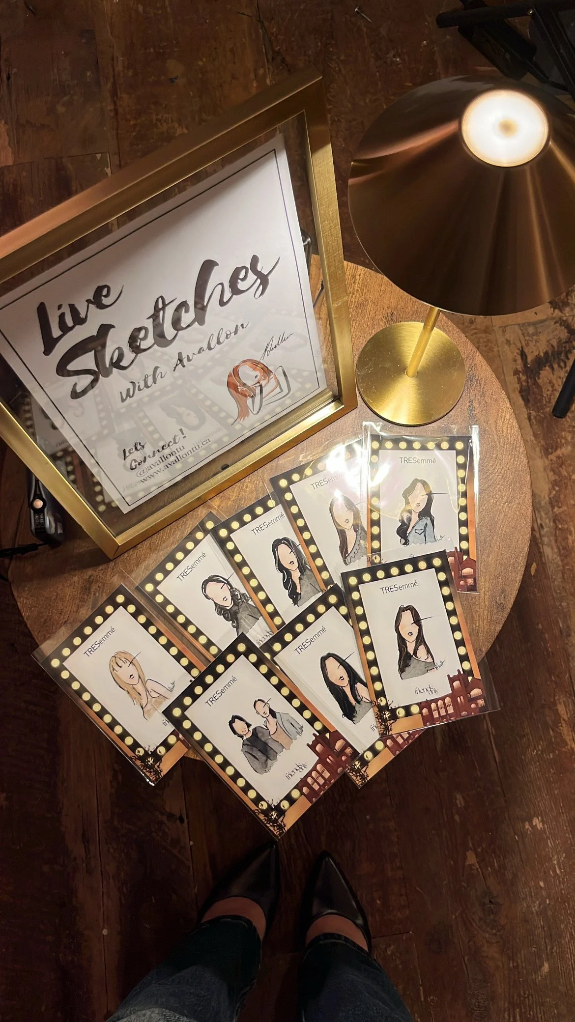 I bring all drawing materials, paper, protective sleeves and simple signage to let guests know what’s happening. All I ask for is a small table, chairs and an outlet if lighting is needed.