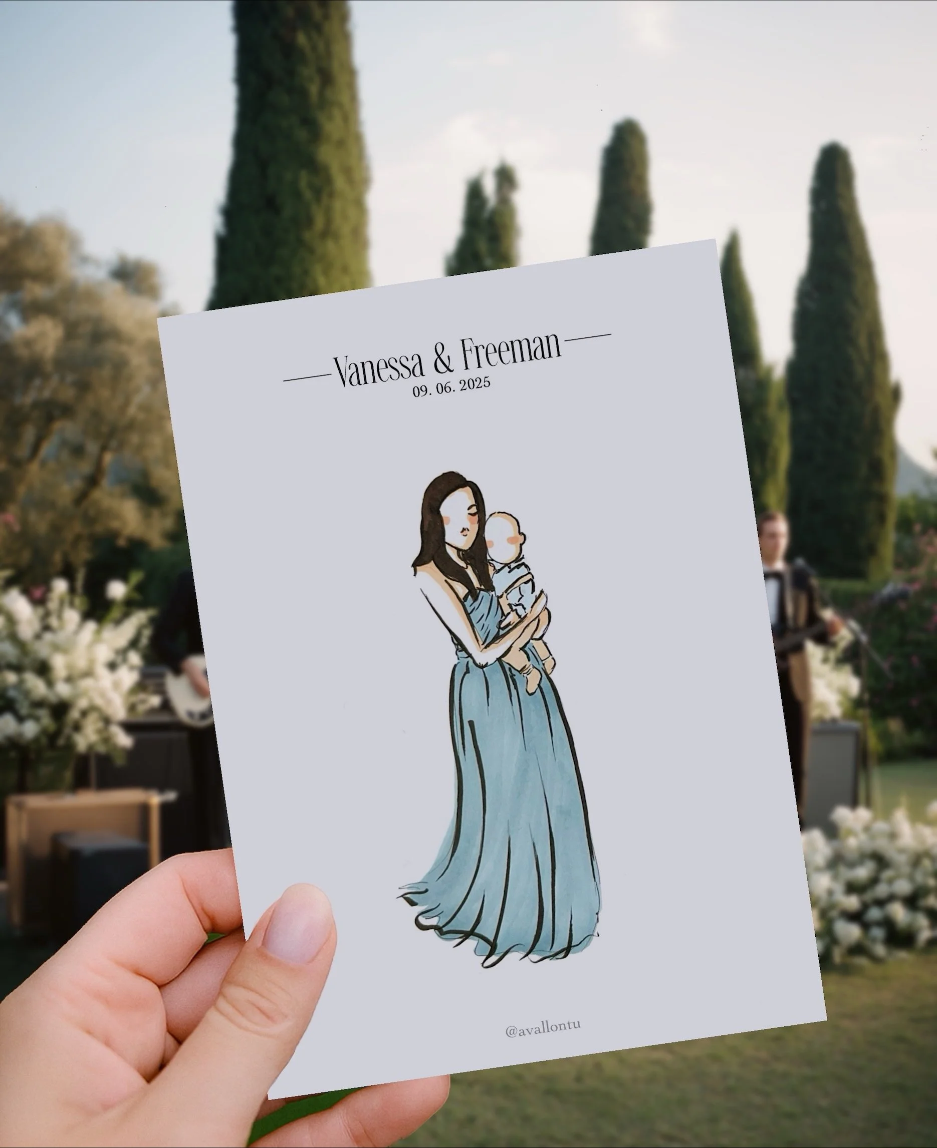 Elevate each hand-drawn portrait with a custom, hand-illustrated background on the drawing paper itself. Crafted to complement your event’s aesthetic, these bespoke details transform each portrait into a truly one-of-a-kind keepsake. Luxurious, personal, and unforgettable.