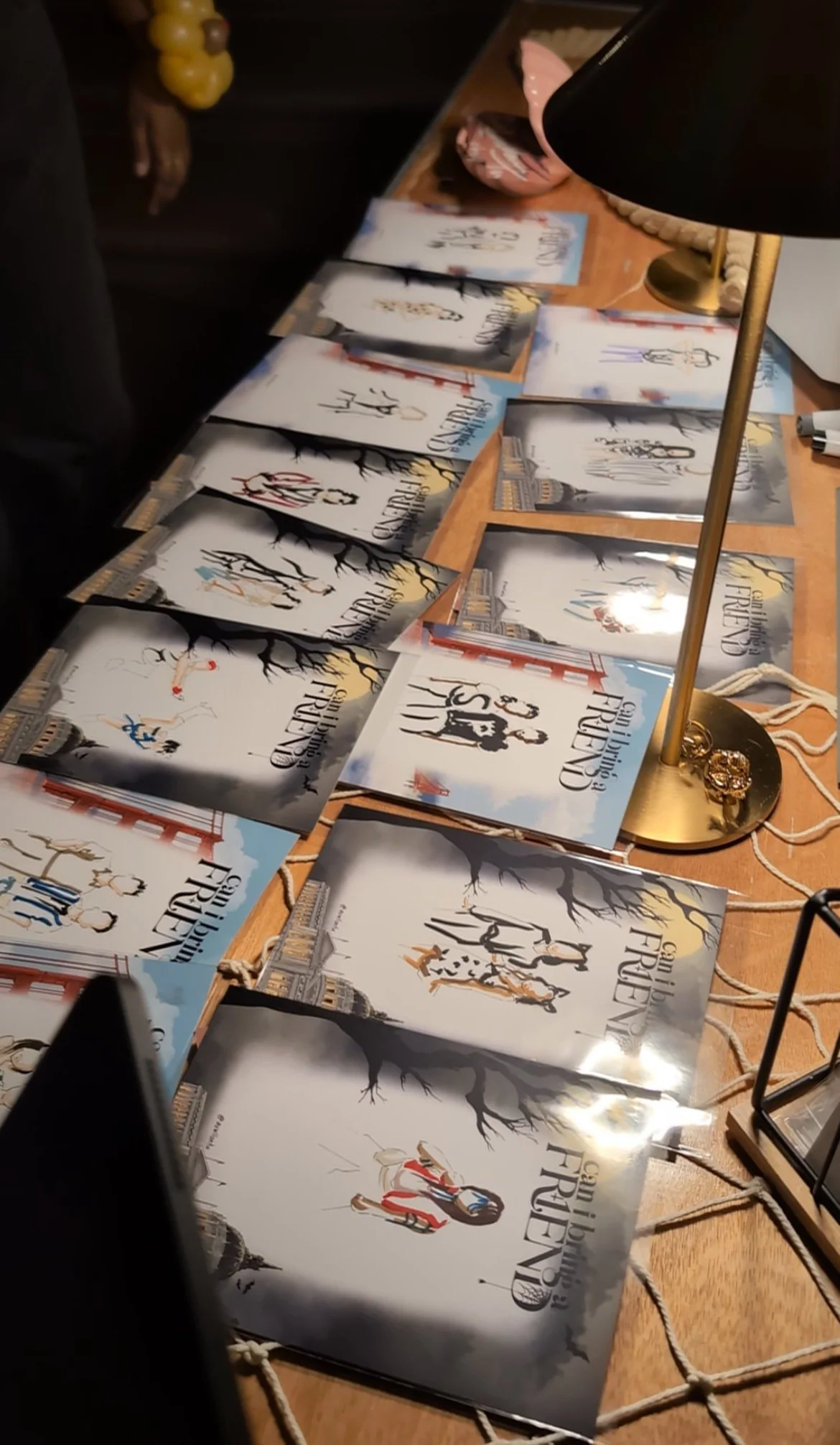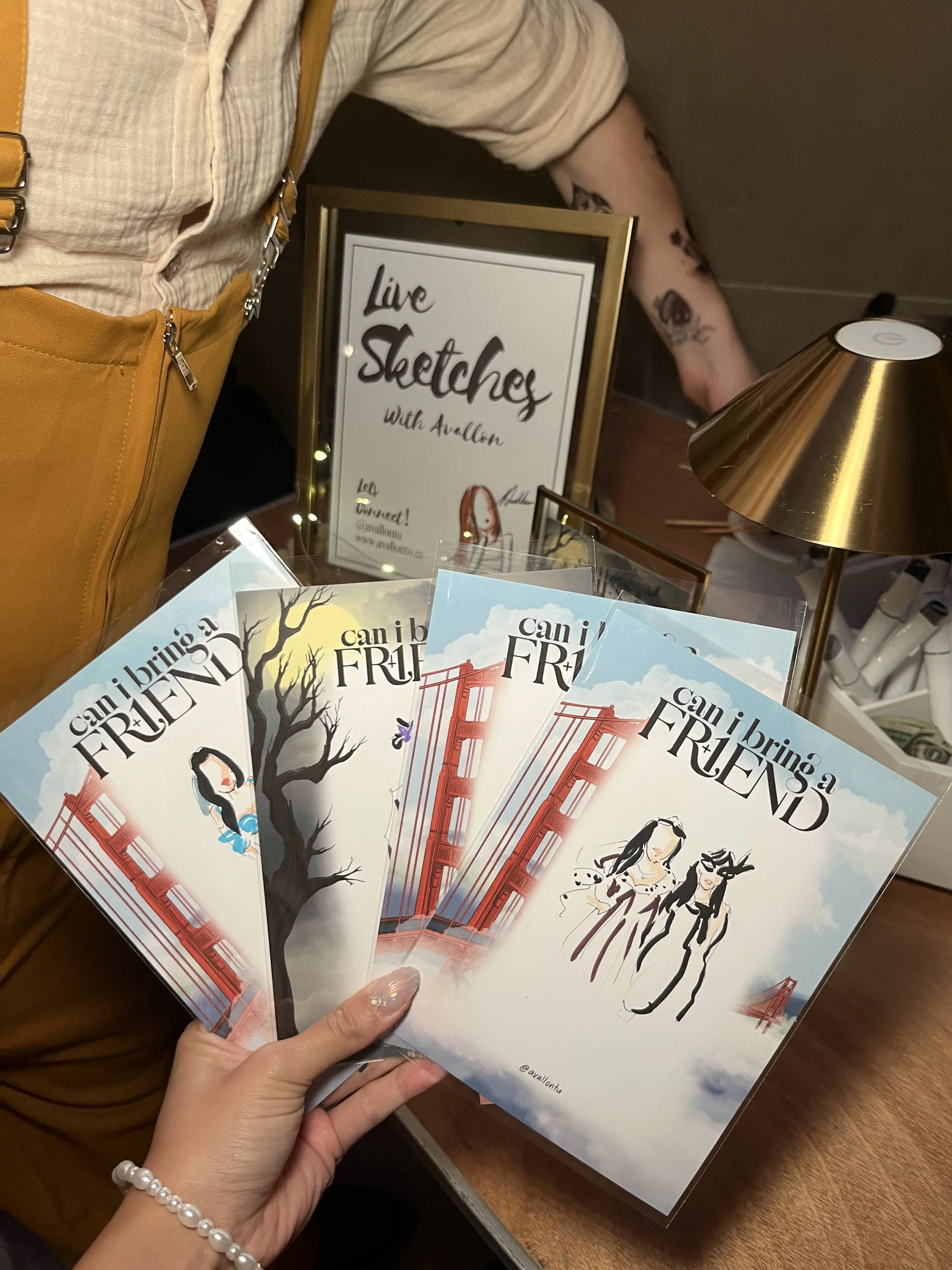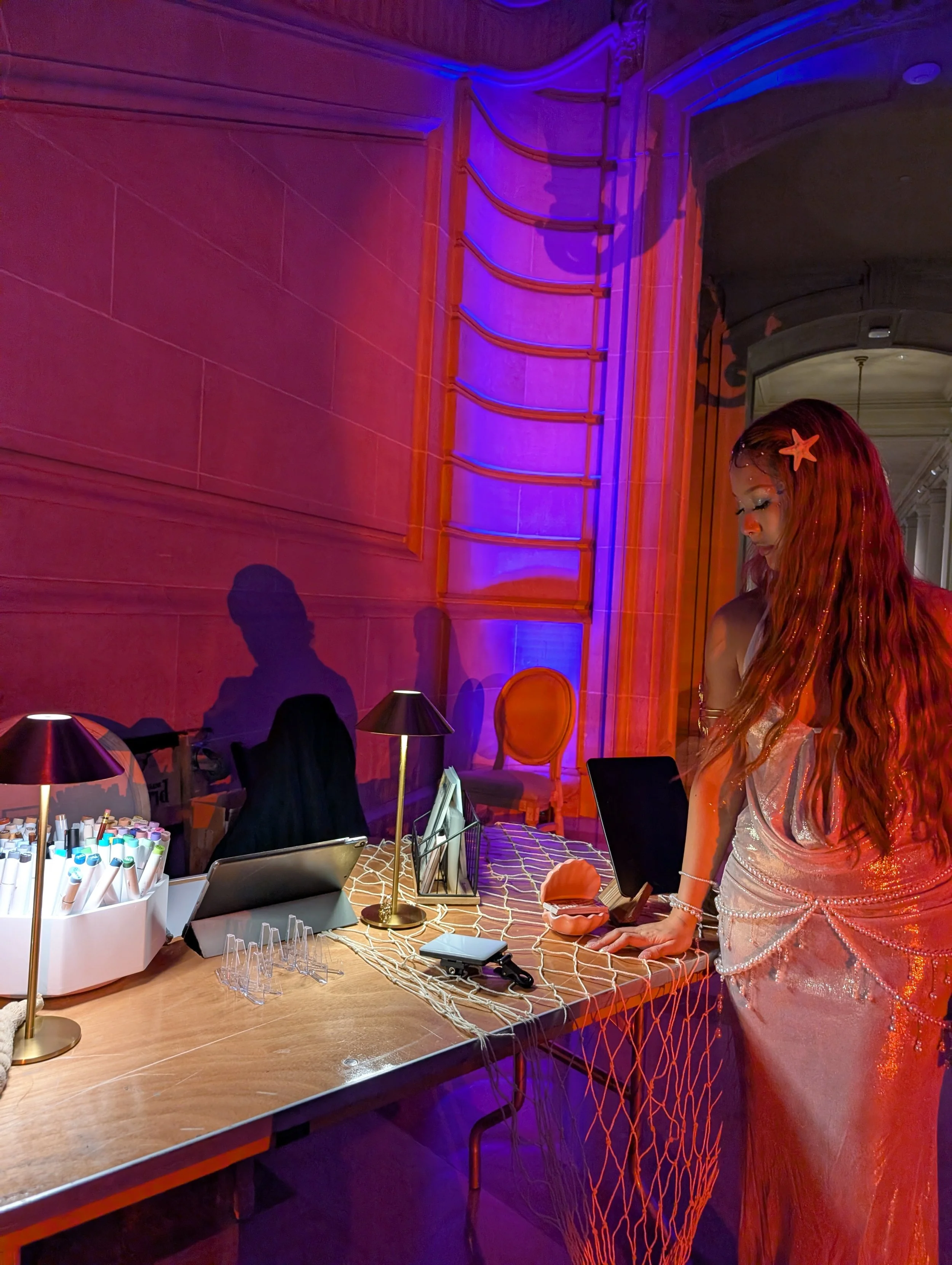 I bring all drawing materials, paper, protective sleeves and simple signage to let guests know what’s happening. All I ask for is a small table, chairs and an outlet if lighting is needed.
